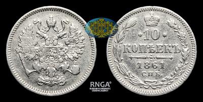 10 Копеек 1861 года, СПБ. Тираж 19 300 000 штук (все типы). Парижский монетный двор