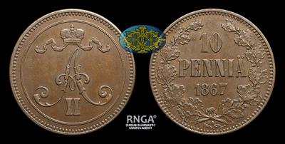 10 ПЕННИ 1867 ГОДА. ТИП 1865-1867 ГОДОВ. Тираж 1 440 000 штук. ГЕЛЬСИНГФОРССКИЙ МОНЕТНЫЙ ДВОР