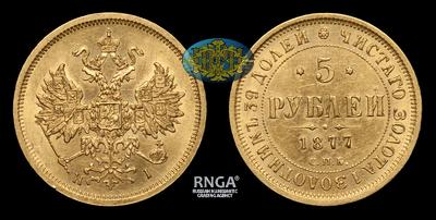 5 Рублей 1877 года, СПБ HI. Тип 1859-1881 года. Тираж 6 600 003 штуки (оба типа). Санкт-Петербургский монетный двор