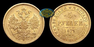 5 Рублей 1879 года, СПБ НФ. Тираж 7 225 005 штук. Санкт-Петербургский монетный двор