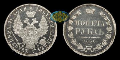 Рубль 1858 года, СПБ ФБ. Тип 1855-1858 годов. Тираж 570 011 штук. Санкт-Петербургский монетный двор