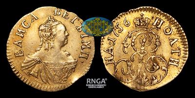 Полтина 1756 года, т.н. "Дворцовая". Тираж 22 389 штук. Красный монетный двор