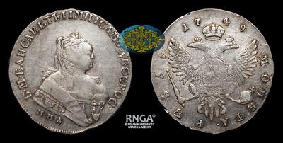 Рубль 1749 года, ММД. Тираж 847 950 штук. Красный монетный двор