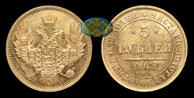 5 Рублей 1848 года, СПБ АГ. Тираж 2 900 001 штука. Санкт-Петербургский монетный двор