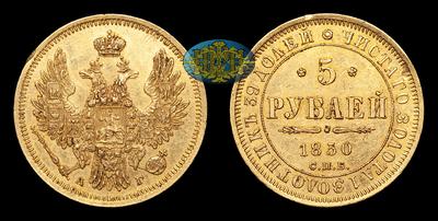 5 Рублей 1850 года, СПБ АГ. Тип 1850-1855 годов. Тираж 3 900 000 штук. Санкт-Петербургский монетный двор