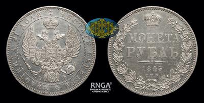 Рубль 1845 года, СПБ КБ. Тираж 682 700 штук (оба типа). Санкт-Петербургский монетный двор