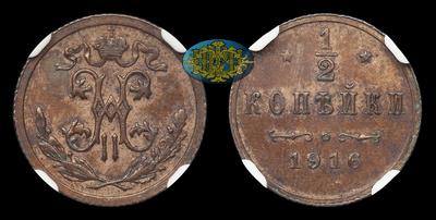 1/2 Копейки 1916 года. Тираж 9 400 000 штук. Санкт-Петербургский монетный двор