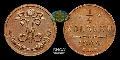 1/4 Копейки 1909 года, СПБ. Тираж 2 000 000 штук. Санкт-Петербургский монетный двор
