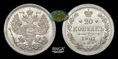 20 Копеек 1907 года, СПБ ЭБ. Тираж 20 000 009 штук. Санкт-Петербургский монетный двор