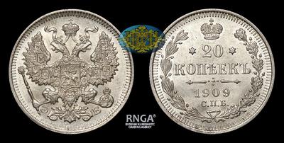 20 Копеек 1909 года, СПБ ЭБ. Тираж 18 875 011 штук. Санкт-Петербургский монетный двор