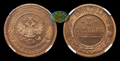 3 КОПЕЙКИ 1906 ГОДА, СПБ. ТИРАЖ 5 666 675 ШТУК. САНКТ-ПЕТЕРБУРГСКИЙ МОНЕТНЫЙ ДВОР