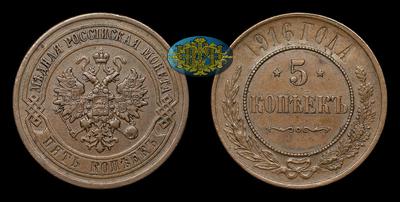 5 КОПЕЕК 1916 ГОДА. ТИП 1916-1917 ГОДОВ. Тираж 8 000 000 штук. САНКТ-ПЕТЕРБУРГСКИЙ МОНЕТНЫЙ ДВОР