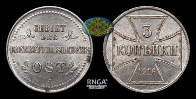 Бона Немецкой оккупации - 3 Копейки 1916 года, J. Тираж 7 100 000 штук.