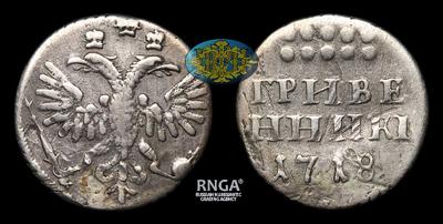 Гривенник 1718 года, LL. Тираж неизвестен. Красный монетный двор.