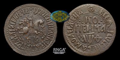 Реверс: Большая розетка сверху. По три точки по сторонам «КО» в «КОПЕЙКА». Титло над датой. Знак «тысяча» перед буквами даты. Круговая надпись в линейном ободке.