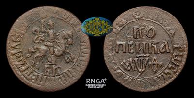 Аверс: Точка сверху. «Плащ – петля 1708-1709 годов». Всадник малый. Без точки между «БК». Круговая надпись в линейном круге.