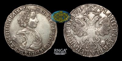 Аверс: Портрет 1705-1706 годов. Голова разделяет круговую надпись. Большой орел на груди. Заклепки на груди. Без вышивки на плаще. Три ряда заклепок на рукаве. Рукав открытый. «Ц» в «ЦРЬ» с длинным хвостиком.