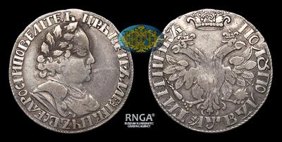 Одна из самых интересных и редких типовых разновидностей полуполтинника 1702 года. Подобное сочетание портрета Императора и гербовой композиции в предыдущих и последующих годах не встречается.