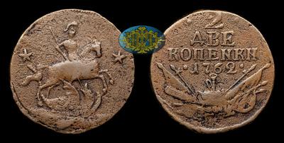2 Копейки 1762 года. Перечекан из Копейки 1757-1761 годов. Тираж неизвестен. Монетный двор неизвестен
