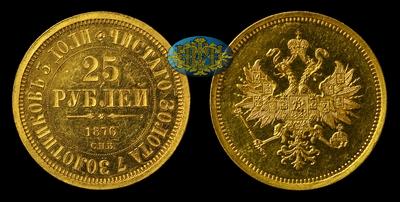 В 1876 году по указу Императора Александра II на Санкт-Петербургском монетном дворе было отчеканено 100 экземпляров монеты номиналом в двадцать пять рублей. Это стало первым случаем изготовления золотой монеты исключительно для подарочных целей. Поводом для выпуска стало 30-летие Великого Князя Владимира Александровича. Великий Князь Владимир Александрович родился 10 апреля 1847 года в Санкт Петербурге. Он был четвертым сыном в семье Императора Александра II и Императрицы Марии Александровны. Вместе со своим старшим братом, будущим Императором Александром III получил прекрасное домашнее образование. С самого детства проявлял большой интерес к военной науке и искусствам. Оба его увлечения в будущем получат свое продолжение. Можно сказать, что военная служба Великого Князя началась с первых дней его жизни. Еще по рождению был назначен шефом Лейб-Гвардии Драгунского Полка. Спустя двадцать один год, в августе 1868 года произведен в чин генерал-майора с назначением в Свиту Его Императорского Величества. В 1872 году становится генерал- адъютантом и членом Государственного Совета. В августе 1874 года произведен в генерал-лейтенанты. Через пару лет, в 1876 году, Великий Князь по Высочайшему указу возглавил Академию Художеств, став одним из самых молодых президентов за всю историю ее существования. Оставаясь под его покровительством и заботой из ее стен выйдет множество талантливых художников. Среди них В.И.Суриков, В.М.Васнецов, В.А.Серов и другие. В 1877 году Владимир Александрович отправляется на войну, где оказывается на передовых позициях. Принимая непосредственное участие в боях с турками, корпус под его командованием отразил несколько ожесточенных атак неприятеля. За военные заслуги во время русско-турецкой войны был награжден орденом Св. Георгия 3 степени. В марте 1881 года, Великий Князь Владимир Александрович назначается командующим войсками Петербургского военного округа. В этом же году Манифестом Александра III он становится регентом несовершеннолетнего Цесаревича Николая. Дядя будущего Императора оказывал сильное влияние на своего племянника. Николай испытывал к нему чувство глубокой робости и даже боязнь. С восшествием на Престол Николая II в 1894 году положение Владимира Александровича и его семьи существенно изменилось. К тому времени к сложившимся весьма непростым отношениям между дядей и племянником добавились существенные противоречия между молодой Государыней и супругой Владимира Александровича Великой Княгиней Марией Павловной. Особенного накала отношения внутри царской семьи достигли к 1905 году. В октябре этого года в Баварии, не получив на то разрешения Николая II, вступает в брак старший сын Великого Князя Владимира Александровича Кирилл Владимирович. Его супругой становится разведенная герцогиня Гессенская. Ситуацию осложнял тот факт, что ее первым мужем был родной брат Императрицы Александры Федоровны. Поступок Кирилла Владимировича мог сказаться на авторитете Императора при Дворе. К тому же на ситуацию сильно влияла Императрица. Через несколько месяцев Кирилл Владимирович по совету родителей возвращается в Петербург, чтобы повиниться перед Царем за своеволие. Однако вместо прощения Царь через графа Федерикса велел Кириллу Владимировичу в тот же день покинуть столицу, объявив, что с этого дня доступ в Россию 
