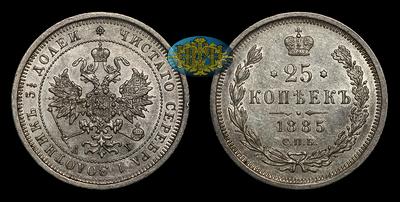 Все 25-копеечники эпохи правления Александра III очень редки. По официальной информации, общее число монет, изготовленных в 1885 году, составило всего 1 011 экземпляров, что является наименьшим тиражом среди монет 1881-1885 годов чеканки.