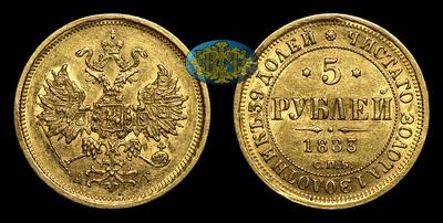 Как известно, 5 рублей 1883 года встречаются с инициалами минцмейстера Дмитрия Сабаниева (ДС) и Апполона Грасгова (АГ). Монеты с буквами “АГ” по сторонам хвоста орла отличаются по деталям аверса. Основная часть тиража (5 632 017 штук) была отчеканена новыми штемпелями 1883 года, и лишь для производства совсем незначительного количества монет применялись штемпеля аверса 1859-1882 годов. 5 рублей 1883 АГ с орлом 1859-1882 годов очень редки.