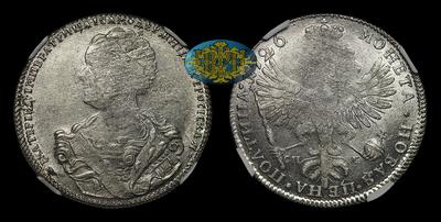 Необыкновенно яркий штемпельный блеск. Лёгкая начальная патина. Непрочекан обеих сторон монеты (часто встречающийся дефект чеканки на монетах больших номиналов времени правления Екатерины I).