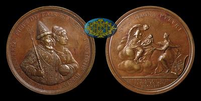 С этой медали начинается проект ретроспективных медалей, посвященных правлению Императора Петра I. Его идейным вдохновителем стал академик Якоб фон Штелин (Jacob von Stehlin, 1709–1785). С 1757 года в его обязанности входило руководство за созданием медалей и развитием медальерного искусства в России. Штелин обратился к идее М.В.Ломоносова о дополнении фонда уже имеющихся медалей Петровского времени вновь создаваемыми экземплярами на события особой исторической важности. Особое внимание было уделено легендам медалей. Было принято решение сделать их на латыни, чтобы они были более понятны в Европе.
