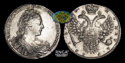Портрет Императрицы такой же, как на редчайшем пробном Рубле с орлом, окруженным цепью ордена Св. Андрея Первозванного на реверсе. Также вызывает интерес ранее не описанное сочетание штемпелей обеих сторон. Подобный тип портрета на аверсе и вариант реверса одинаково выделены в специальном каталоге-определителе по рублям Анны Иоанновны Е.Г.Полуйко (Е.Г.Полуйко, Горький 1989 г. “Рубль Анны Иоанновны” Аверс: Группа 1730.1. № 001 (!). Рисунок 01 / Реверс: Группа 1730.7. № 006 (!). Рисунок 01). По мнению автора, степень редкости обеих монет соответствует “!”