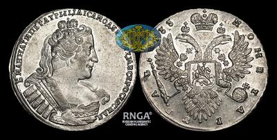 Реверс: Центральная корона высокая, украшена тремя большими камнями и четырьмя жемчужинами. Малые короны с крестами. Головы орла с языками. Ости между перьев на крыльях орла. Св. Георгий в плаще. Звезды в цепи ордена Св. Андрея Первозванного. Крест державы простой. Крест на скипетре. Центральное перо в хвосте орла длиннее. Ничего не разделяет круговую надпись.