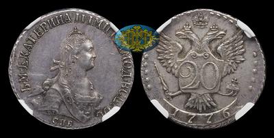 Новодельные 20 копеек 1776 года известны с двумя вариантами аверса, отличающимися между собой типу портрета Императрицы. Тип портрета на данном экземпляре подобен тому, какой можно видеть на двадцатикопеечниках 1772-1776 годов регулярного чекана, однако со многими отличиями, характерными именно для новоделов. Портрет отличается большей рельефностью высокой детализацией и мельчайшей проработкой. Такие же отличия наблюдаются на гербовой композиции. Кроме прочего, гуртовая насечка имеет иной наклон и большее заглубление, нежели на тиражных монетах. Следует заметить, что предложенный нами экземпляр значительно реже Предложенный нами экземпляр является наиболее редким. По имеющийся у нас информации всего второй экземпляр новодела 20 копеек 1776 с портретом Екатерины II образца 1773-1776 годов (лучший по степени сохранности) когда-либо появлявшийся на открытых аукционных торгах. Отсутствовал во всех, наиболее известных нумизматических собраниях дореволюционной России, собраниях, включая коллекции Великого Князя Георгия Михайловича, графа И.И.Толстого и В.Фукса (Германия). Также не был представлен в числе лотов аукциона при продаже дублетов русских музеев.