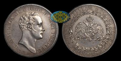 Пробный рубль 1827 года с портретом Императора Николая I представляет высочайший исторический и коллекционный интерес как один из примеров работы над созданием образа монеты нового типа. Известны исключительно в качестве новоделов в сочетании с тремя вариантами гуртового оформления. Судя по характерным особенностям, вероятнее всего, были изготовлены в первой трети-середине XIX века. Автором штемпелей стал один из самых известных резчиков Санкт-Петербургского Монетного Двора за все годы его работы - Яков Рейхель (1780-1856). Его имя, вместе с К.Леберехтом, П.Уткиным, Г.Губе и А.Лялиным связывают с расцветом медальерного искусства в России в первой половине XIX века. Именно Рейхель вошел в историю, как создатель знаменитого «Константиновского» рубля 1825 года. Пробный рубль 1827 года с портретом Николая I по расположению и деталям изображений во многом напоминает рубль Константина. На нем также особое внимание уделяется образу Императора. Его портрет отличается высоким рельефом, с мельчайшей проработкой элементов прически и черт лица. Учитывая высочайшую сложность исполнения и относительно небольшой буртик, не способный защитить монету от скорого истирания, можно предположить, что рубль так и остался бы пробным и никогда не был бы утвержден в качестве тиражного. Заслуживает внимания реверс монеты. Здесь также прослеживается сходство с рублем Константина Павловича. Круговая надпись и орел (но другого типа), помещенный внутрь перевязанного лентами лаврового венка на обоих экземплярах схожи.