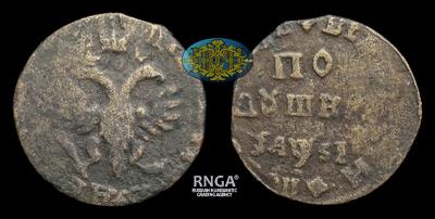Реверс: Четырехлистник сверху. Буквы номинала малые. Без украшений по сторонам. «ПО» в «ПОЛУШКА». Буквы даты малые. Четырехлистник снизу. «ВСЕЯ РОССIИ ПОВЕЛИТЕЛЬ».