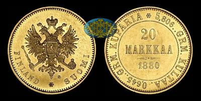 20 марок 1880 года, S Для Финляндии. Гельсингфорсский монетный двор.