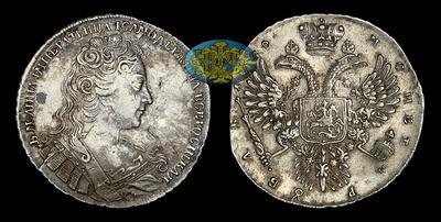 Рубль 1730 года Кадашевский монетный двор. Край корсажа не параллелен окружности. 5 наплечников без фестонов. Звезды разделяют легенду реверса.