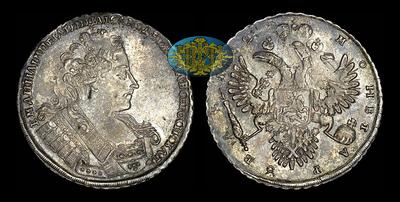 Рубль 1732 года С брошью на груди. 7 жемчужин на груди. 11 трилистников в ленте на плече, 4 в нижней ленте. Легенда реверса ничем не разделена. Крест державы простой. Скипетр без креста. Малые короны с крестами. Орел без языков.