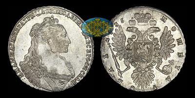 Рубль 1735 года Кадашевский монетный двор. 8 жемчужин в волосах, 15 на груди. Двоеточие в начале легенды аверса. Хвост орла острый.