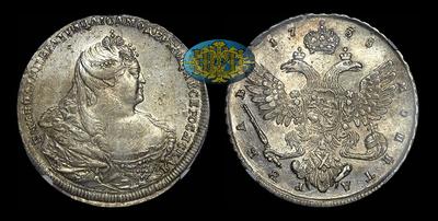 Красный монетный двор. Портрет работы Л. Дмитриева. 5 жемчужин в прическе. На реверсе корона больше.