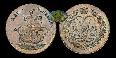 2 копейки 1757 года. Новодел Номинал над Св. Георгием