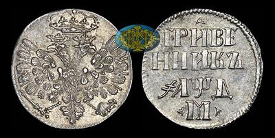 Гривенник 1704 года, М Кадашевский монетный двор. М между трилистниками. Корона над орлом без жемчужин. Малый крест на державе.