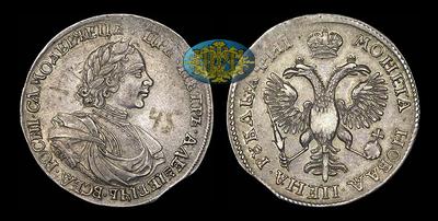 Рубль 1718 года, ОК-L Кадашевский монетный двор. Маленькая голова. Без арабесок на груди. С ошибкой в легенде аверса "росNI". L на хвосте орла. "мОнета" в легенде реверса.