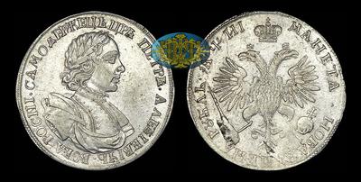 Рубль 1718 года, ОК Кадашевский монетный двор. Без арабесок на груди. С ошибкой в легенде аверса "росNI". "мАнета" в легенде реверса.