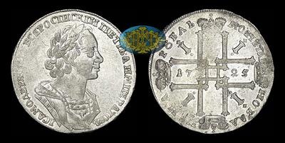 Рубль 1725 года, без букв Портрет в античном плаще - погрудный портрет (т.н. "Матрос"). Красный монетный двор. Без знака гравера. В легенде аверса "всросIИскIИ" вместо "всеросИIскИI".