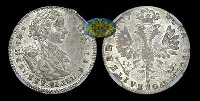 Кадашевский монетный двор. Дата обозначена арабскими цифрами. Малая голова. Кресты после "ПЕТРЪ" и "АЛЕЗIЕВИЧЪ" в легенде аверса.