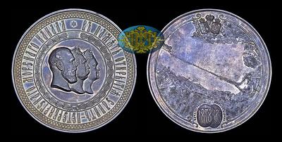 Золотисто-серая патина. Крупные медали, отчеканенные в серебре, довольно редки, особенно в подобной высоко коллекционной сохранности.