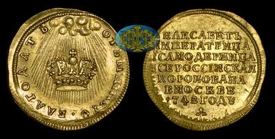 В ночь на 25 ноября 1741 года в России произошёл дворцовый переворот, в результате которого к власти пришла дочь Петра I Елизавета. На следующий день был обнародован манифест о вступлении Императрицы на престол. Параллельно с решением первоочередных государственных задач начались приготовления и к будущей коронации. За следующие пять месяцев список государственных регалий пополнится государственным знаменем, мечом, щитом и печатью. Будет изготовлена Императорская корона, пошиты коронационные мантия и одежды. Отчеканены медали и жетоны.