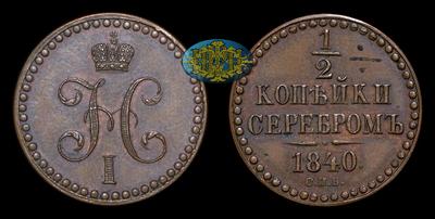 1/2 КОПЕЙКИ 1840 ГОДА, СПB (СПБ) НОВОДЕЛ