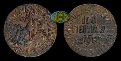 Всадник на вздыбленном коне. Точка над головой всадника. ".Б.К.". Слитное "ЦР" в "ЦРЬ". "ВЕЛИКIИ". "АЛЕЗIЕВИЧЬ".