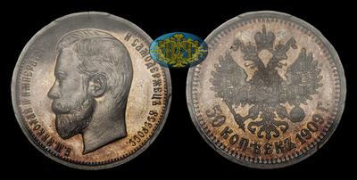 Один из малотиражных полтинников Николая II. Отчеканено всего 50 011 штук, из которых совсем небольшое количество в исполнении PROOF. Дополнительную ценность данному экземпляру придает его исключительный провенанс. Происходит из двух замечательных нумизматических собраний, владельцами которых особое внимание отводилось качеству собираемого материала.