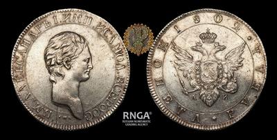 Один из самых редких новоделов пробных рублей с портретом Александра I.